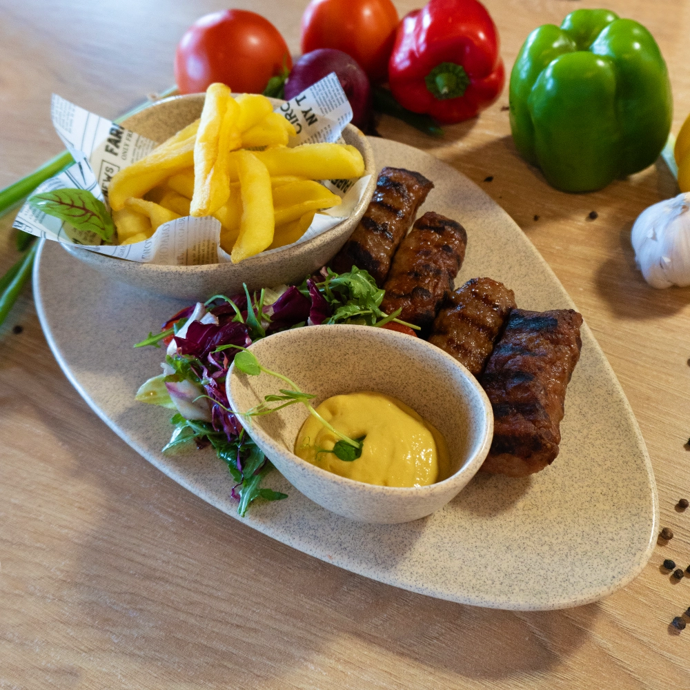 (4 mici dar mari, cartofi fry & dip, sos muștar, mix salată) 240g/200g/50g